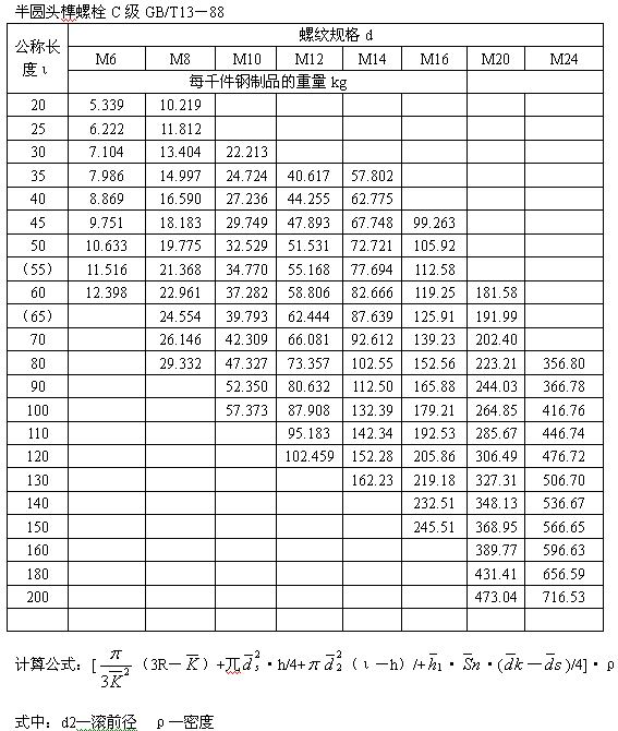 编者按86版紧固件有关国家标准不再含有紧固件重量部分,根据紧固件行业生产经营的需要,应部分紧固件厂商的要求,沈阳标准件研究所所长张金明结合多年从事紧固件生产技术的实验经验,对符合2004年底之前现行有效紧固件有关标准的产品重量,根据生产实际进行了理论重量公式推导,并且籍助于计算机功能较为准确的进行了理论重量计算。本刊自2005年第2期刊登以后,受到广大读者的好评。为了满足读者的要求,本刊将继续刊载供大家参考使用。